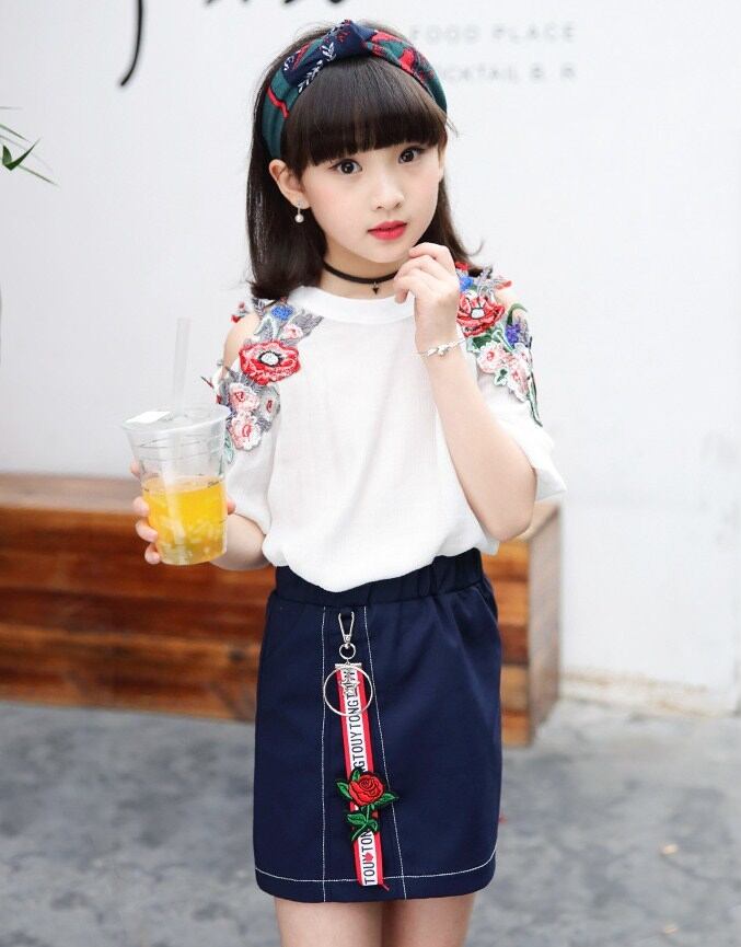 ちょっとレトロな花柄刺繍がお洒落 Tシャツ+スカート 上下セットアップ